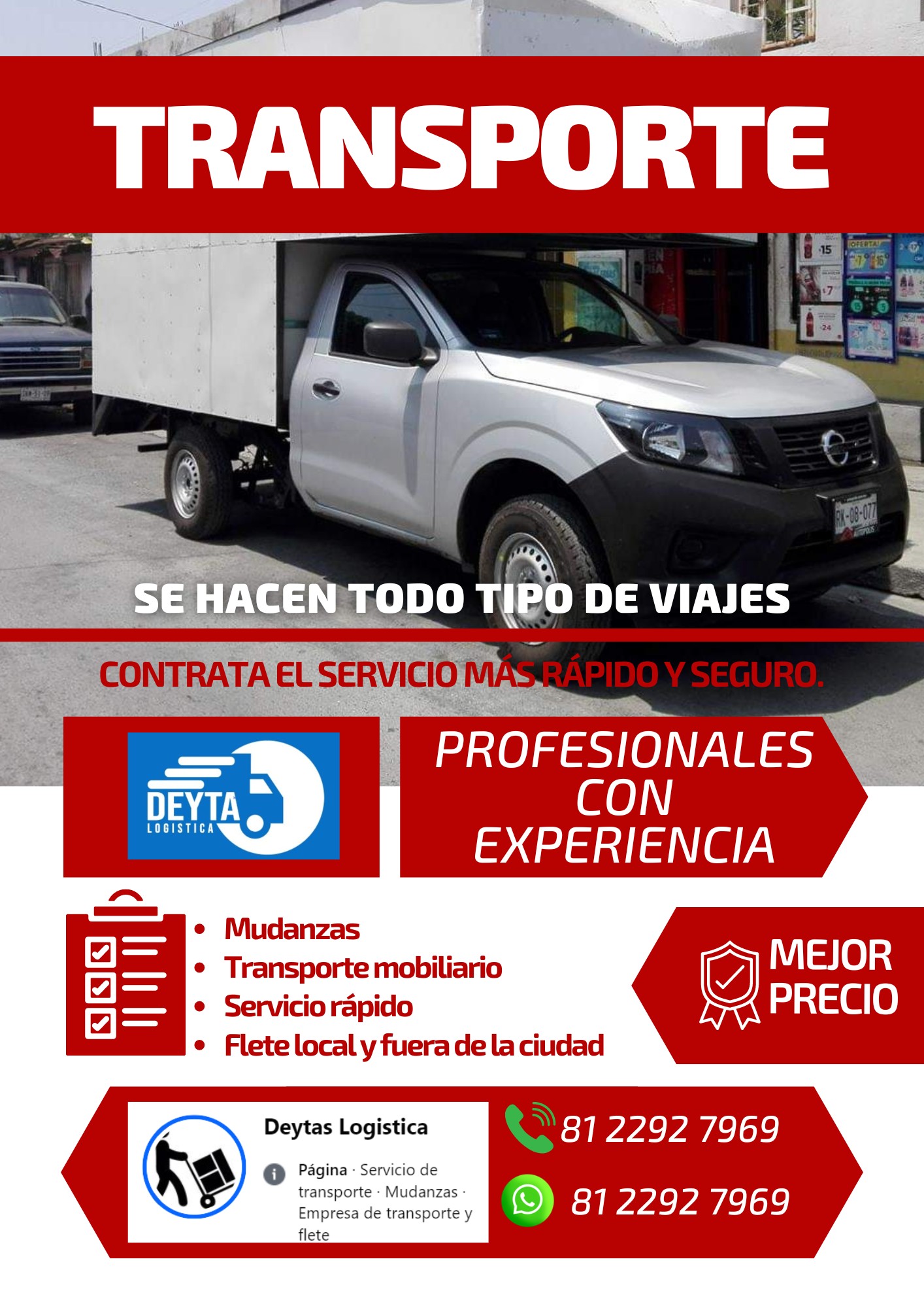 Tuve que hacer una mudanza y estaba preocupado por el manejo de mis cosas. Deyta se encargó de todo, desde la carga hasta la entrega, con un trato responsable y ordenado. Fueron rápidos, cuidadosos y muy claros en todo el proceso. Me quedé muy satisfecho con el servicio y los recomiendo ampliamente.